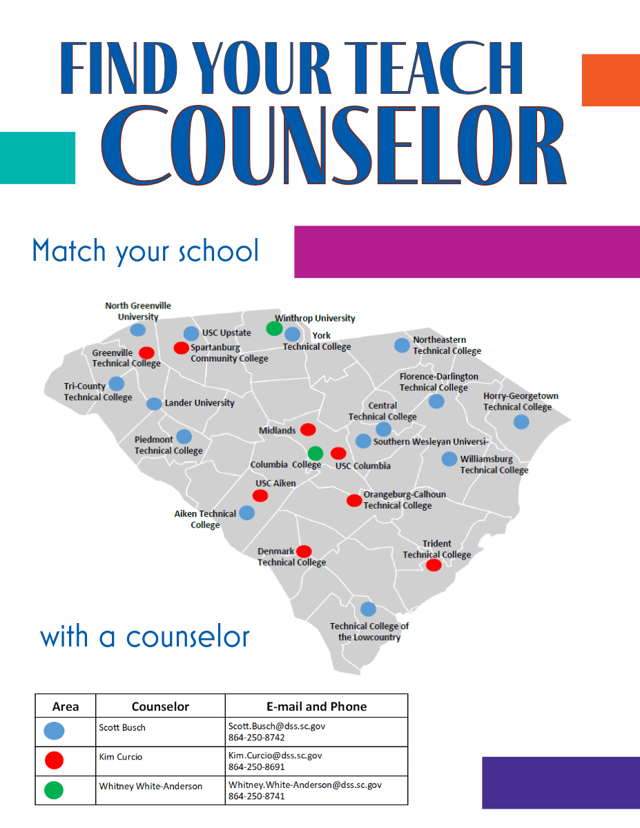 Looking for some one-on-one help, you can now setup a virtual meeting with a TEACH counselor working your area by clicking the button below. To learn who your TEACH counselor is for your area follow the chart below. Expand your knowledge of the TEACH program with the TEACH Handbook. Learn more about Release Time and the Laptop Grant by clicking the buttons below.