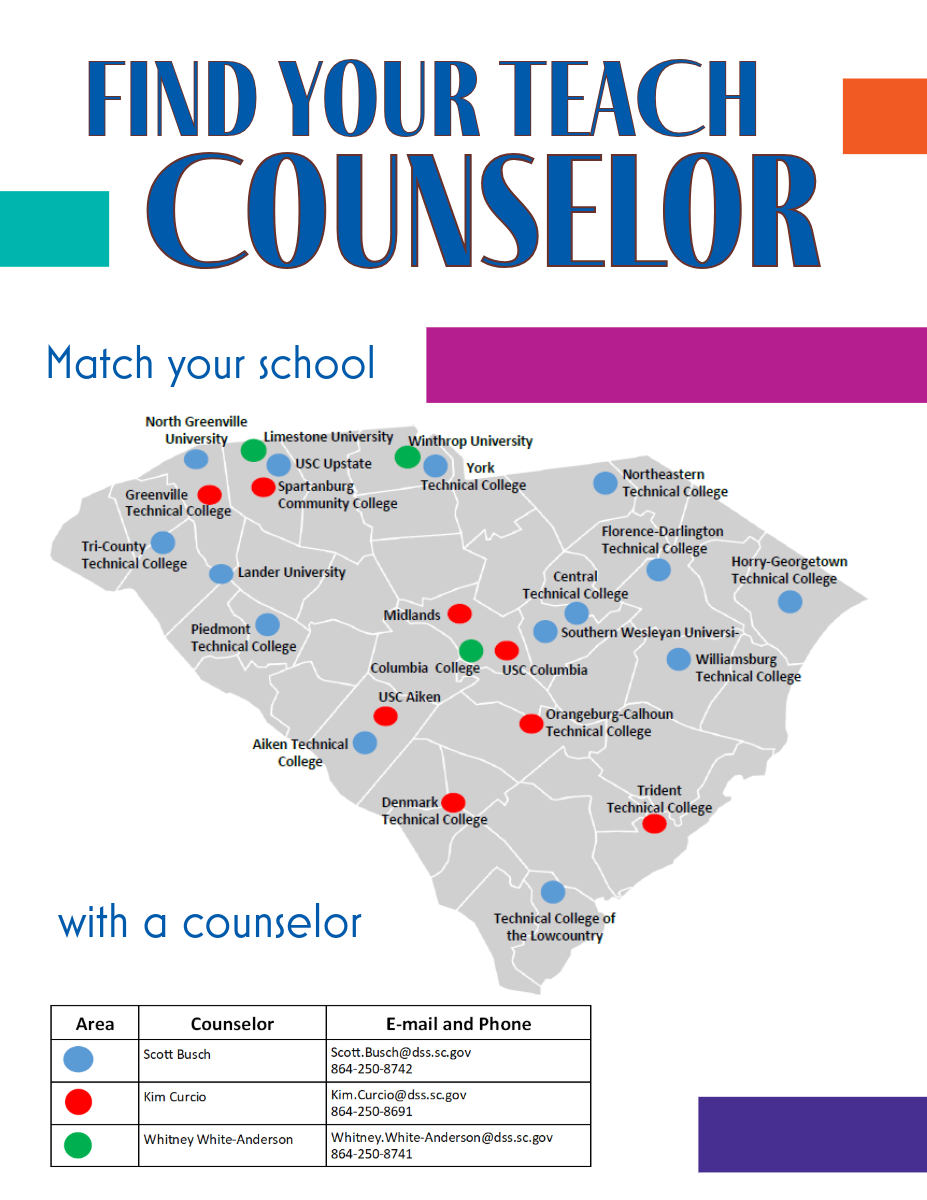Looking for some one-on-one help, you can now setup a virtual meeting with a TEACH counselor working your area by clicking the button below. To learn who your TEACH counselor is for your area follow the chart below. Expand your knowledge of the TEACH program with the TEACH Handbook. Learn more about Release Time and the Laptop Grant by clicking the buttons below.